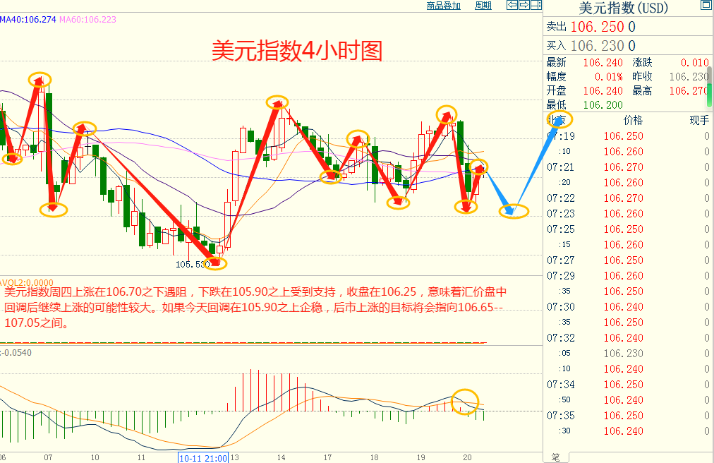 美指周四上涨在106.70之下遇阻,下跌在105.90之上受到支持,意味着美元短线下跌后有可能保持上涨的走势。如果美指今天下跌在105.90之上企稳,后市上涨的目标将会指向106.65--107.05之间。今天美指短线阻力在106.60--106.65,短线重要阻力在107.00--107.05。今天美指短线支持在105.90--105.95,短线重要支持在105.55--105.60。