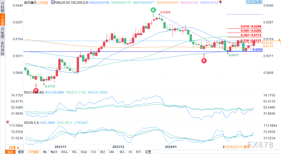 纽元兑美元延续了上周三(2月14日)开始的上涨势头,周一盘中小幅上涨至0.6150,为一周最高水平。