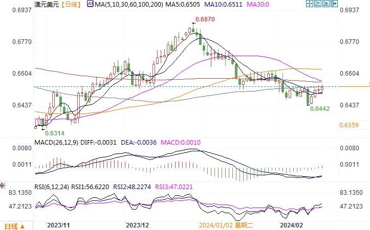 上周五(2月16日),澳元/美元持稳,上周五收涨0.1%,收盘于0.6531,扳回因美国PPI数据强劲而出现的跌幅。在澳洲,疲软的就业报告导致市场定价中更多地反映澳洲央行降息的风险,6月放松政策的可能性被认为是五五开。但澳新银行(ANZ)澳洲经济部主管提醒说,招聘模式的变化表明,2月就业数据可能会反弹。“虽然劳动力市场正在降温,但我们认为近期的数据夸大了降温的速度,”,“因此,我们仍预期澳洲央行在11月之前暂时不会降息,尽管我们承认风险可能偏向于更早开始降息。”此外,中国市场在春节假期结束后恢复交易,中国市场可能左右市场情绪。上述种种市场基本面氛围或有助于澳元暂时稳住下行的脚步。技术面上,日线图动能指标走高,表明有筑底的可能。若收于多次考验的21日移动均线0.6540上方,将是积极信号。2月和2024年趋势低点0.6443是初步重要支撑位。上周五纽约时段PPI数据公布后交投区间0.6497-0.6544中的高点若能突破,澳元或有望继续反弹回升。