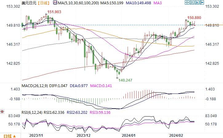 上周五(2月16日),美元指数尾盘上涨0.01%至104.26,当周上涨约0.12%。美元兑日元上涨0.22%,报150.23。自中国春节期间美元兑日元穿破了150水平后,在上周过去几天,美元兑日元自高点150.88水平处有所回落,使市场高度警惕日本当局可能会入市干预来减缓日元的跌势。上周,美国劳工部公布的1月生产者价格涨幅为五个月来最大,而周二公布的1月消费者价格涨幅也高于预期。但周四公布的美国1月零售销售创10个月来最大降幅,11月和12月数据也被下修,这让市场上的一些人稍作喘息,因该报告表明,消费者支出势头正在放缓。总体来说上周美国的数据对于美元的抬捧有限,美元基本保持稳定的状态。日元也自年初的低点有所回升。 目前的焦点仍然是美元降息预期大幅降低使美元保持着强势,而对收益率敏感的日元则因此受到极大的牵制呈现弱势的走向。日线图上,美元兑日元保持在布林带通道中轨线之上,维持着上升的走势形态。短线有超买调整欲求,且要谨慎防范日本央行干预的风险。短期波动范围料将落于149-151之间。