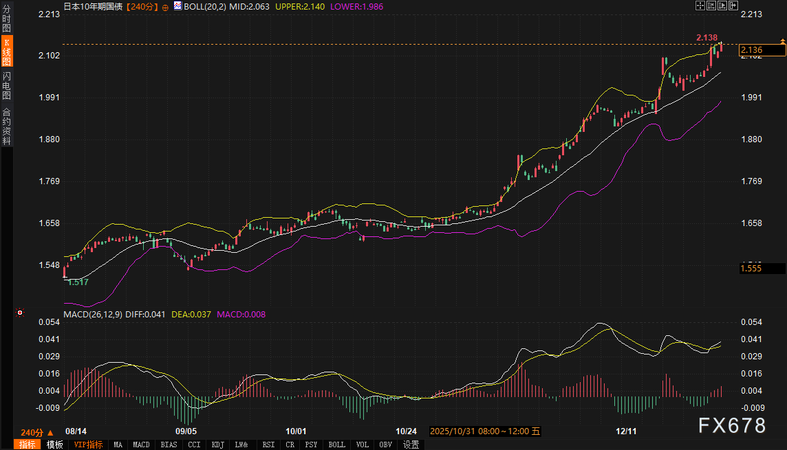 10年期日债收益率(参考合约:JP10Y):技术走势极为强劲,价格已触及布林带上轨(2.140),MACD持续上行。这明确反映了市场正在测试日本央行容忍度的基本面逻辑。2.14%-2.15%是近三十年来的绝对高位阻力区,任何进一步的突破都将强化全球债市的避险情绪。