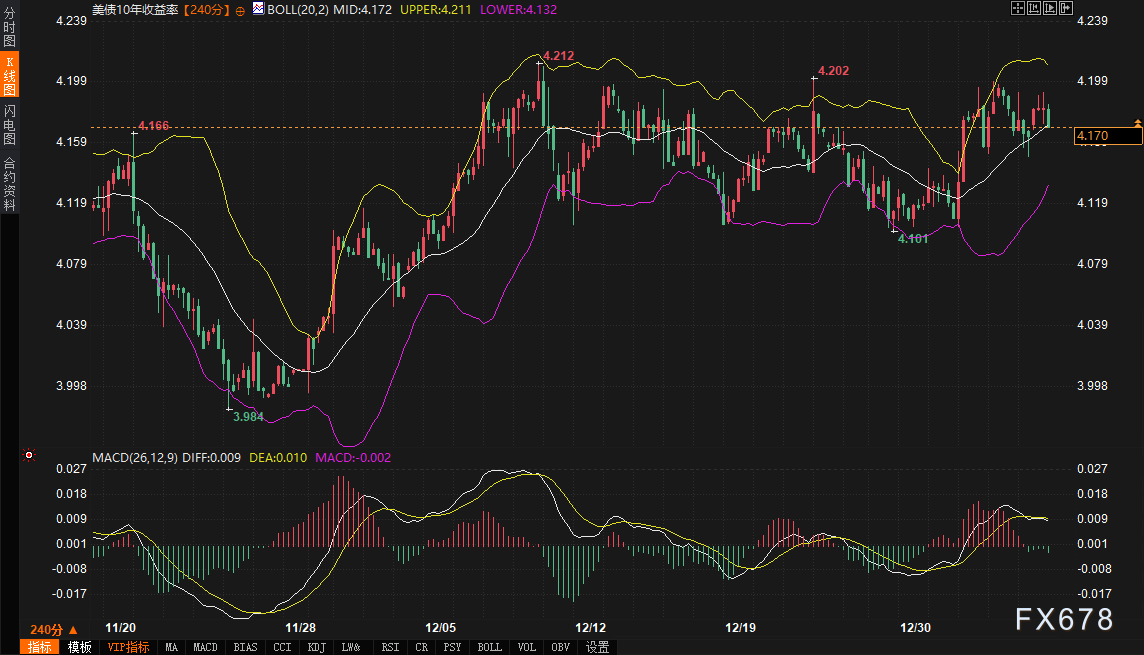 10年期美债收益率(参考合约:US10Y):4小时图布林带通道呈收窄态势,当前收益率紧贴中轨(4.172)运行,上方阻力在4.211,下方支撑在4.132。MACD的DIFF与DEA均位于零轴上方极窄区域,显示多空动能均不显著。知名机构战术偏向于在4.11%附近做空10年期美债,并寻求在强势时加仓,预期短期波动区间在4.18%-4.14%。盘中需密切关注收益率能否站稳4.18%上方,若突破4.21%则可能打开上行空间,反之跌穿4.13%可能引发向4.08%的测试。