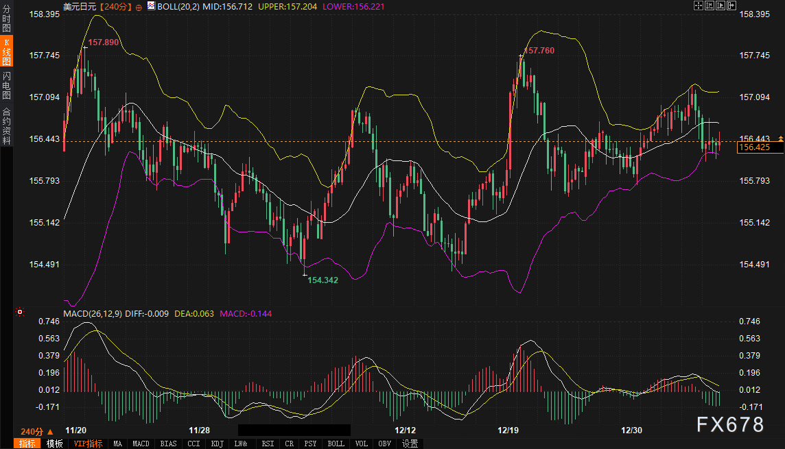 美元兑日元(参考合约:USD/JPY):汇率目前处于4小时布林带中轨(156.712)下方,并接近下轨(156.221),显示短期承压。MACD指标中DIFF值为负(-0.008),且位于DEA线(0.063)之下,表明下行压力正在积聚。汇率上方的强阻力区域在157.00-157.20(布林带上轨附近),若日债收益率飙升引发日本官方干预预期升温或避险资金回流日元,汇率可能测试155.80-156.00的支撑强度。
