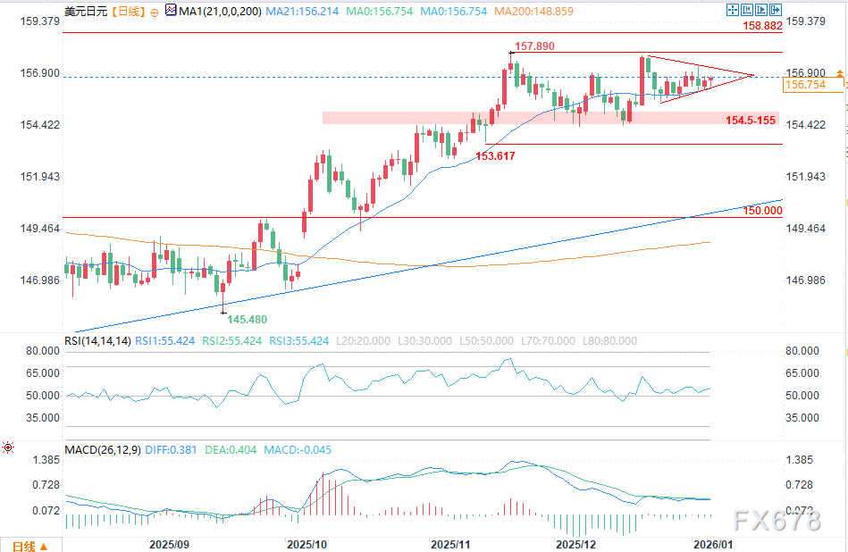 尽管如此,从美元/日元图表来看,这更像是盘整而非趋势反转。需要关注的关键水平是更大级别三角形形态的趋势支撑以及21日指数移动平均线,两者均位于156.00附近。只要多头能够守住该区域,上行偏向就仍然成立。然而,若明确跌破该区域,则可能打开进一步回落至155.00的空间。