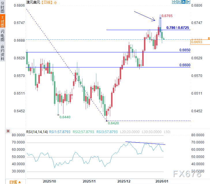 如果此次就业报告确实优于预期,那么美联储不仅可能彻底打消1月降息的念头,甚至其3月降息的可能性也会受到质疑,这将提振美元走强。在此情境下,澳元/美元或将延续跌势,向下测试0.6650中段区域,甚至是前期阻力(现已转化为支撑)0.6600关口。然而,若就业数据强劲,推动汇价回升至其78.6%斐波那契回撤位0.6725上方,则当前的短期看跌倾向将被扭转。
