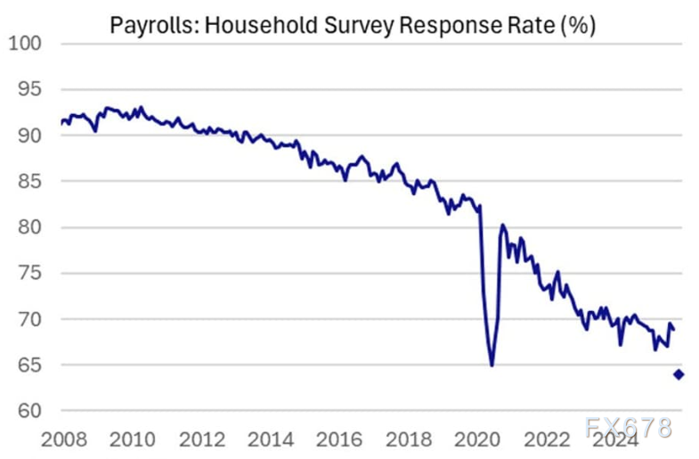 交易员对此次数据反应可能平淡的另一个原因在于非农就业调查回复率的结构性下降。下图显示,过去十余年间,美国劳工统计局的调查回复率急剧下滑,这意味着当前就业数据的不确定性已远超以往: