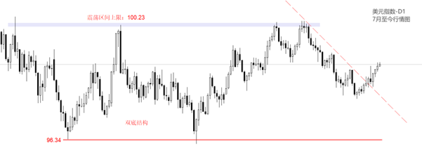 2025年7月份至今形成的震荡区间,下限为96.34点,上限为100.23,过去半年时间没有哪一个波段曾有效突破上下限。最新的上涨波段同样面临考验。首先是上限100.23,或者是100整数关口。