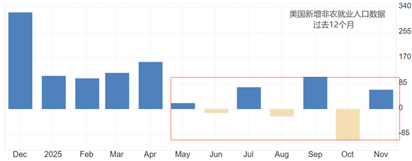 市场机构之所以给出相对稳定的预期,是因为12月份美国并没有出现如10~11月份那般的政府停摆事件。特朗普最常用的关税战,也未在12月份重提。所以,6万人左右的非农就业人口预期较为合理。