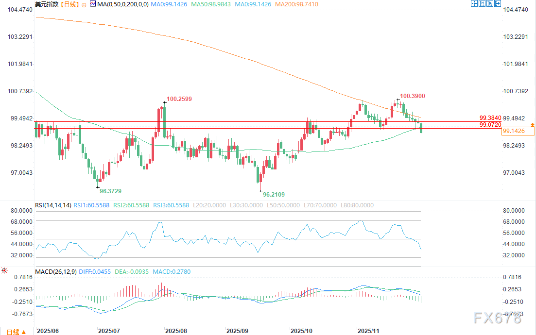 可能阻碍多头突破的是99.072–99.384的回撤区间。目前,该指数正处于这一区间附近波动。若持续跌破区间下限99.072,可能出现日内走弱。相反,若突破区间上限99.384,则可能触发进一步加速上涨。