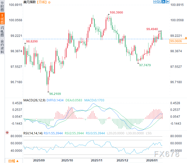周二亚市时段,美元指数于99.10附近震荡,此前一个交易日一度触及七周高点99.49,而后显著回落跌幅约0.49%。