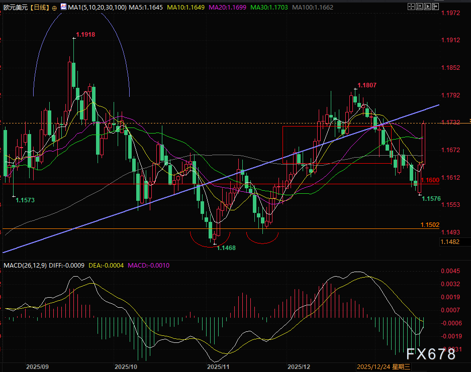 技术面欧元直接从箱体底部涨回了箱体顶部,目前正在测试箱体顶部的支撑,压力位在1.1750和目前测试的1.1725。
