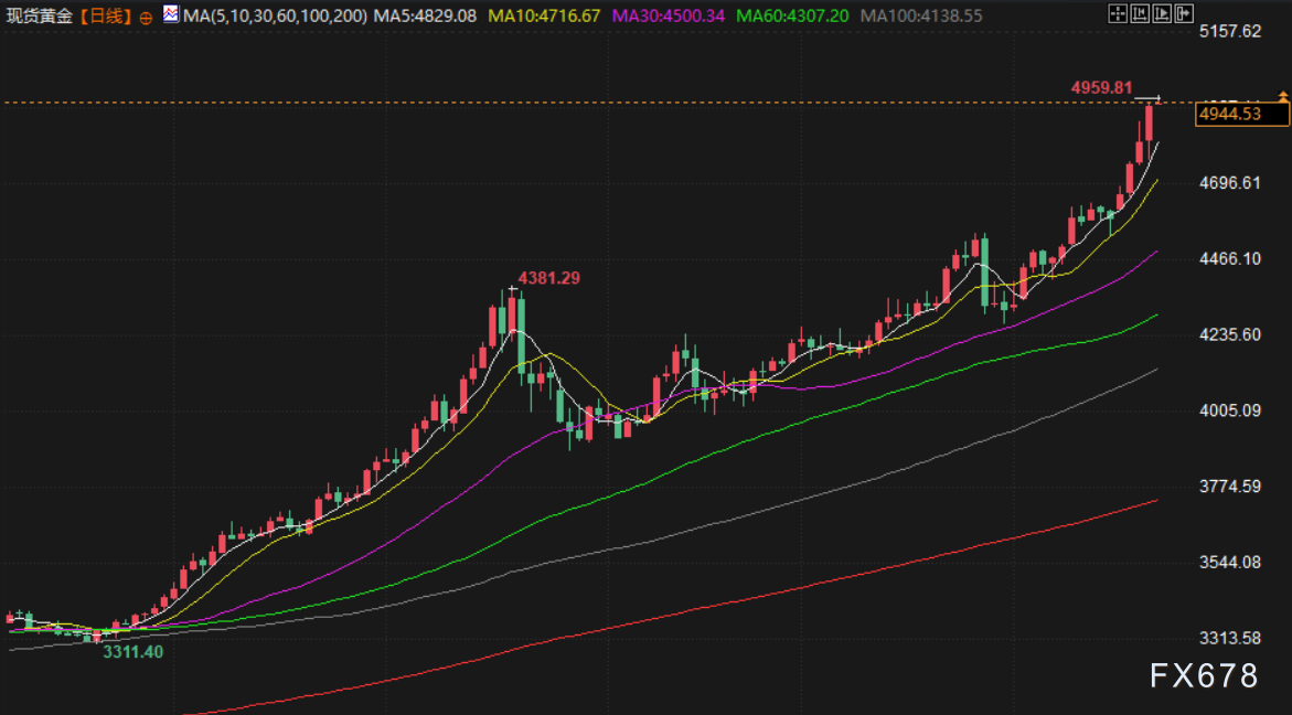 周四贵金属市场集体飙升,现货黄金首次突破每盎司4900美元大关,同时白银与铂金价格也延续强劲涨势,齐创纪录。现货白银首次升至每盎司96.58美元,现货铂金大涨4.6%,达到2601.03美元的新高。