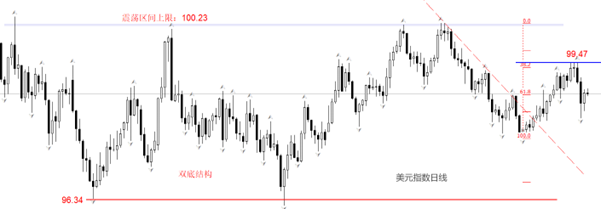 行情方面,美元指数仍在延续震荡走势,下限96.34~上限100.23,仍未被有效突破。最近一个月的反弹走势正在被最近一周的下跌走势所取代。反弹最高点99.47,没能站上100关口,多头主力仍未敢发力。最近两条阴K线幅度过大,短时间内多头聚集人气的难度较高。目前技术面无法给出明确的多空信号,美指后续发展以来数据和政策的发布。