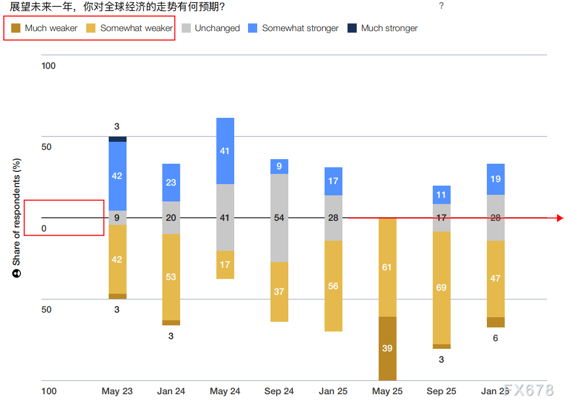 53%的首席经济学家预计全球经济形势将恶化,28%认为不会有变化,19%则预期经济会走强。因此未来一年的全球经济前景偏向负面——不过与去年的预期相比,市场情绪有所好转。