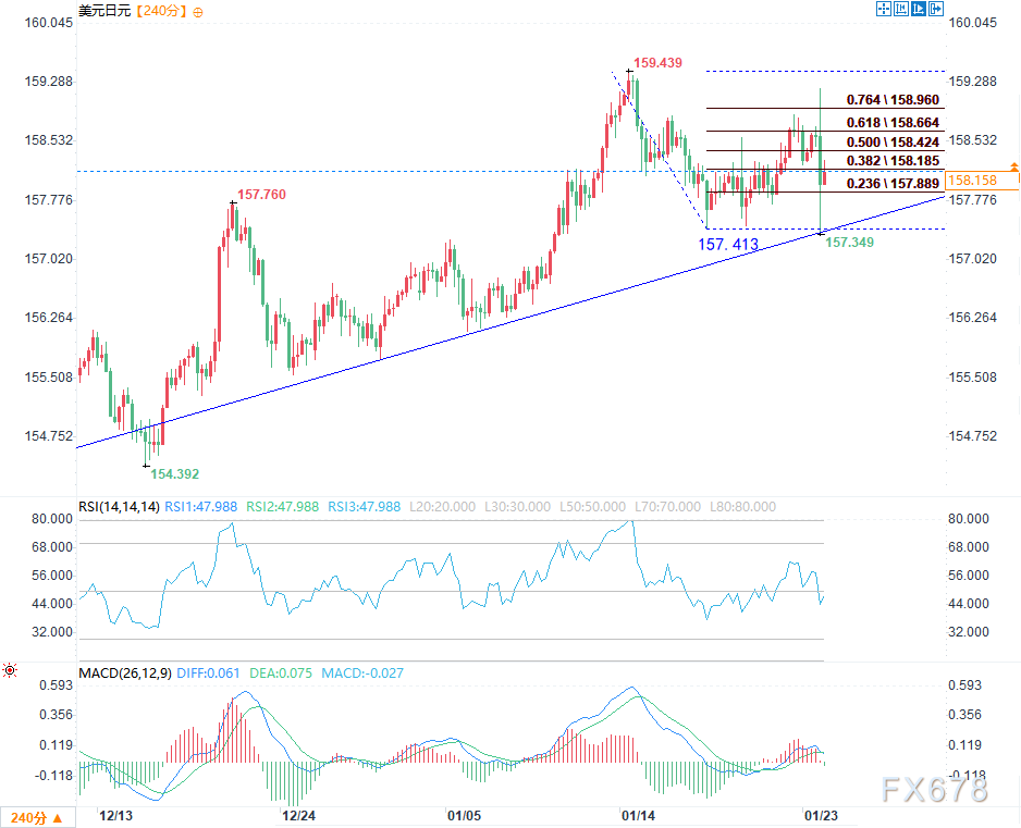 周五(1月23日)欧盘时段,美元/日元(USD/JPY)呈现“冲高回落+V型反弹”的剧烈波动。价格早盘震荡上行,午后加速拉升至接近159.30的日内高点。价格在探底后逐步反弹,目前回升至158.20一线,处于日内均价(158.45)下方,短期走势偏弱。