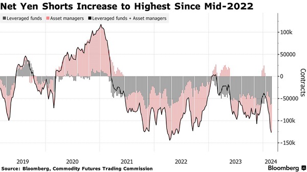 投机者正在押注日元将进一步贬值。根据美国商品期货交易委员会(CFTC)的数据,杠杆基金和资产管理公司持有的日元净空头头寸上周增加至2022年年中以来最高水平。