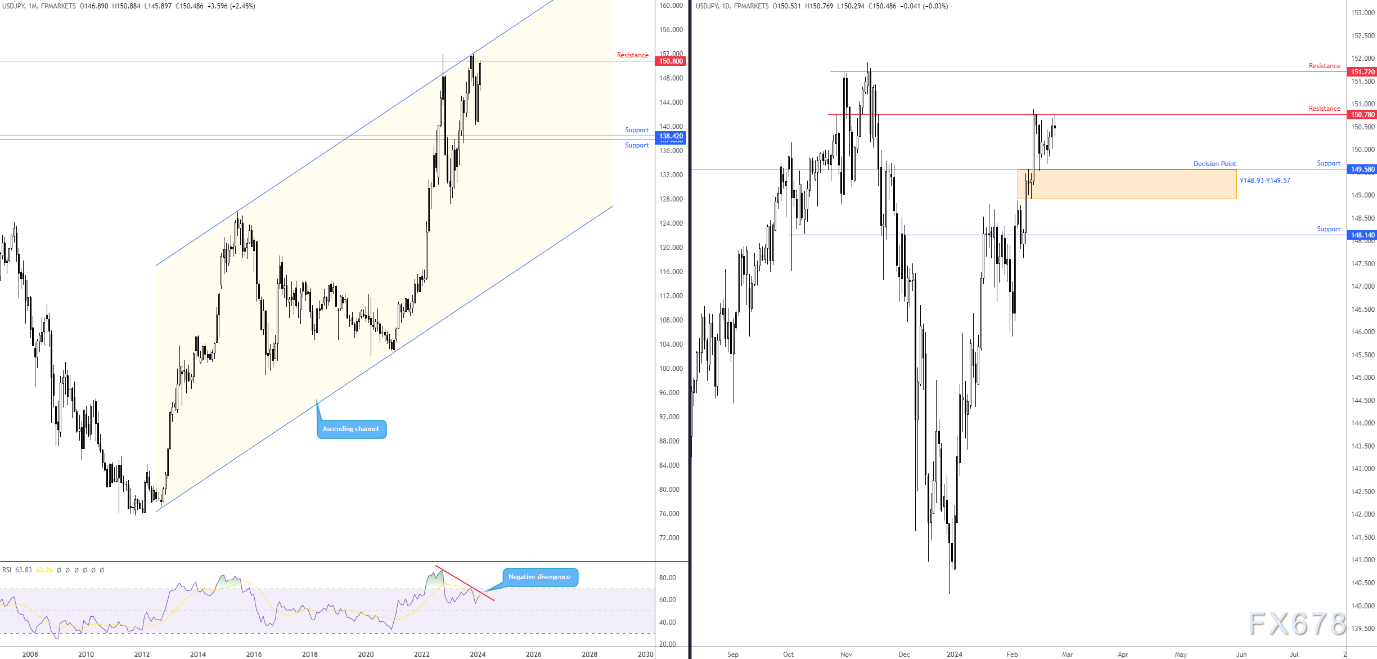 2月13日突破走高,美元/日元留下148.93至149.57之间的决策点区域,以及149.58日元的支撑位,阻力位为150.78日元。尽管从技术上讲,月度阻力位于150.80日元,日阻力位于150.78两个点,但日阻力和未能突破149.58支撑位带来的看跌反应平淡,向市场传达了买家可能会试图买入的信号,在未来几周内吞噬当前的阻力。