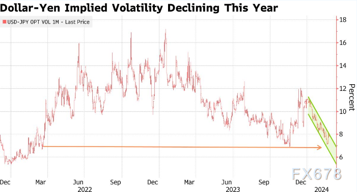 策略师表示,美元/日元的一个月隐含波动率可能会降至2022年3月以来的最低水平。加剧这一下跌的是该货币对每日交易区间的缩小,这是由于相互限制双向波动的力量造成的。