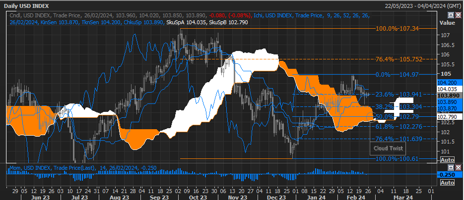 在美国通胀成为焦点的繁忙一周开始之际,美元早盘涨势有所减弱。美元指数最终可能会跌破费波纳奇回档位103.304,这是100.610-104.970(12月至2月)升幅的38.2%回档位。