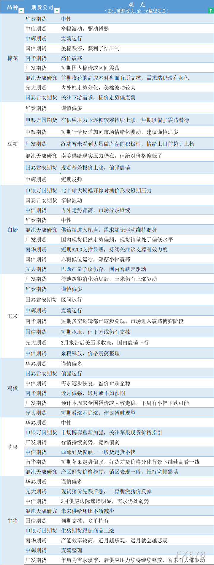 期货公司观点汇总一张图:3月11日农产品(棉花、豆粕、白糖、玉米、鸡蛋、生猪等)