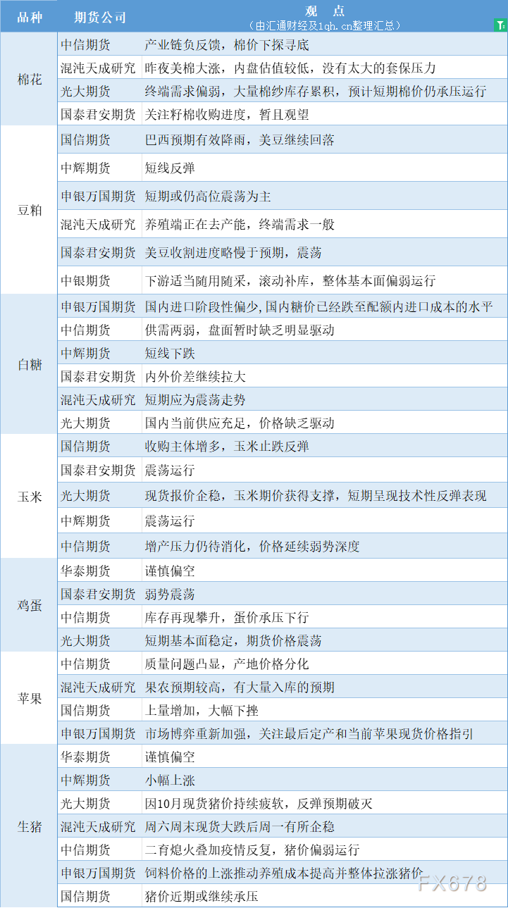 期货公司观点汇总一张图:10月24日农产品(棉花、豆粕、白糖、玉米、鸡蛋、生猪等)