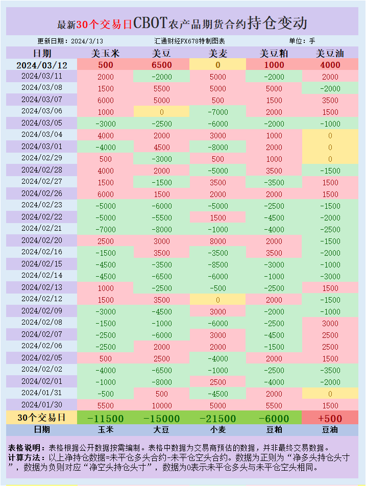 根据汇通财经观察,海外交易商估算的结果显示,本周二(3月12日),大宗商品基金增加CBOT美豆、美豆油、美豆粕、美玉米投机性净多头头寸,美小麦未平仓多头与未平仓空头相同。最新30个交易日,大宗商品基金增加CBOT美豆粕、美豆、美玉米、美小麦投机性净空头头寸,增加美豆油投机性净多头头寸。