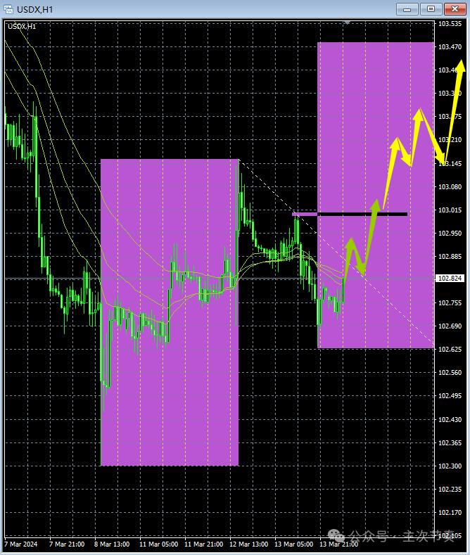 美元依然处在4小时图跌势,这个不变;上图中的1小时图看做abc反弹节奏,那么当前可能在c的开端,走势中有两道阻力来作为确认:第1道是下降趋势线所在的102.88,第2道是103.00,这是道氏点阻力。c的反弹目标则是在103.50下方附近。