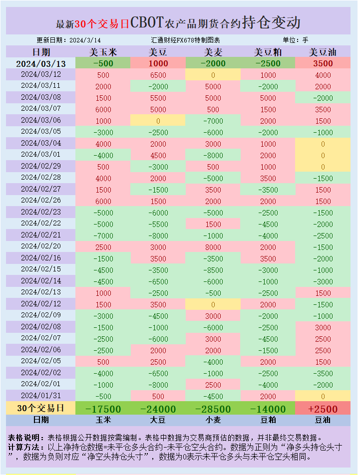 海外交易商估算的结果显示,本周三(3月13日),大宗商品基金增加CBOT美豆、美豆油投机性净多头头寸,增加美小麦、美豆粕、美玉米投机性净空头头寸。最新30个交易日,大宗商品基金增加CBOT美豆粕、美豆、美玉米、美小麦投机性净空头头寸,增加美豆油投机性净多头头寸。