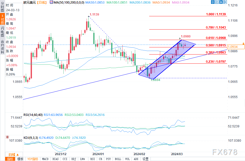 周三(3月13日),美元指数冲高回落走平,欧元兑美元欧盘时段上涨,最高触及1.0947。英镑兑美元震荡走平。