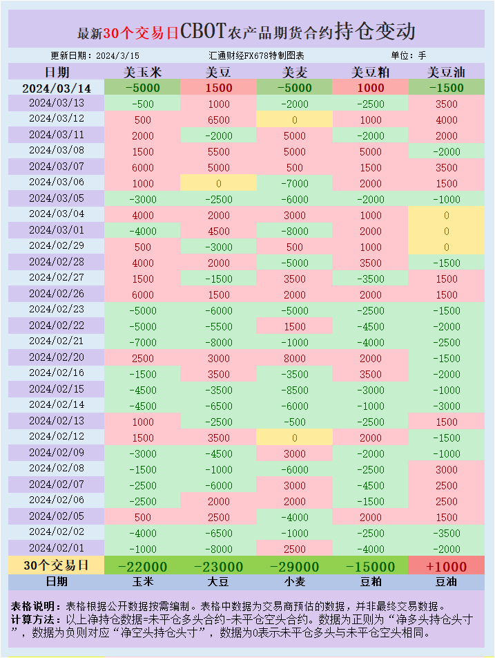 根据汇通财经观察,海外交易商估算的结果显示,本周四(3月14日),大宗商品基金增加CBOT美豆、美豆粕投机性净多头头寸,增加美小麦、美豆油、美玉米投机性净空头头寸。最新30个交易日,大宗商品基金增加CBOT美豆粕、美豆、美玉米、美小麦投机性净空头头寸,增加美豆油投机性净多头头寸。