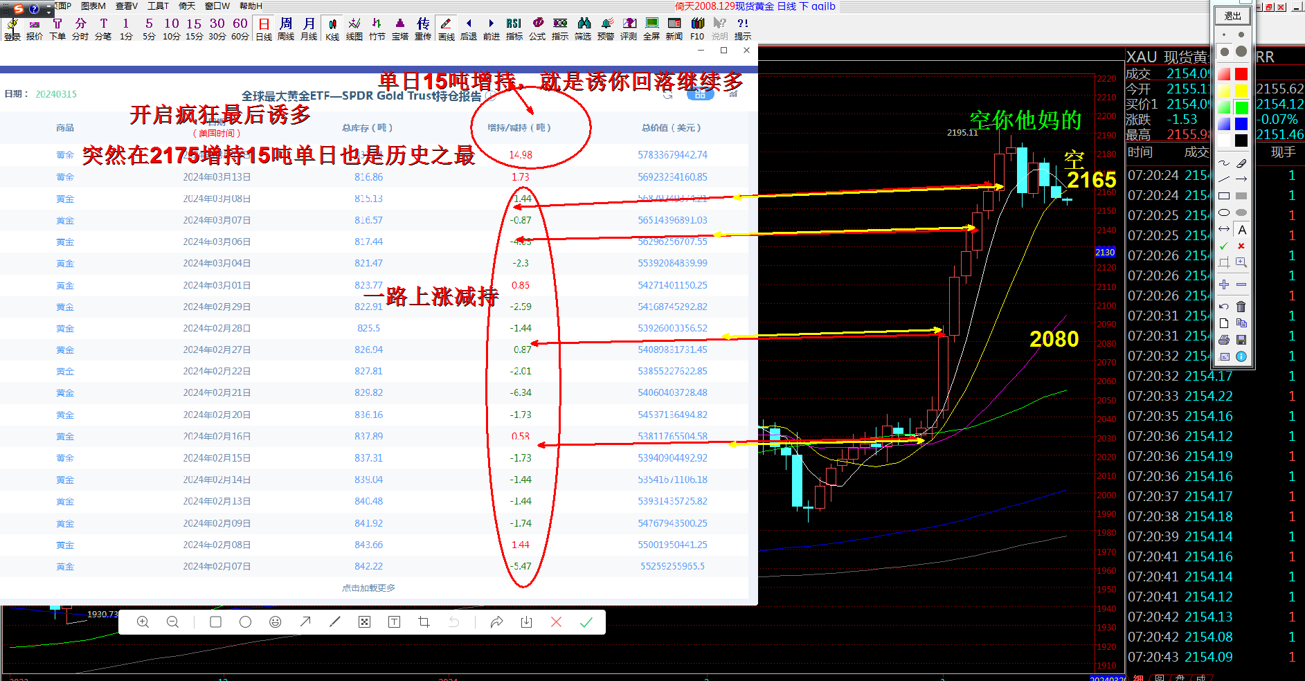 周五黄金竟然增持15吨,基本最近三年最大一次,除了去年11月7号的13吨,这次也是比较大的幅度,如果突破2195那么说明主力在2170区域做多,如果继续下跌,那么就是说主力诱多散户接盘自己出逃,究竟增持限制下跌幅度,还是新一轮上涨,也许周四美联储会议给出方向,暂时运行2154区域,距离前高2145在咫尺,多空争夺白热化。如果黄金是一个稳定的投资收益品种,而且还是在连续新高下,那么肯定很多资金去疯狂购买,那就是说ETF是会量不断放大,但是我们最近两月ETF持仓看,现在黄金历史新高附近,但是持仓连续两个月在上涨里减持,相比去年的930吨持仓,减持了100多吨,为何他们在不断减持?那就是至少一点对后期涨幅力度不乐观,一时的避险上涨最终目的让人接盘,所以适当关注多头持续动能,每次半夜上涨拉升,给你一个熟悉味道,就是涨突然回头一跌跌120美金的行情,也许都忘记了退一万步讲上涨行情,那么三年上轨2080也要多次回测验证支撑,所以有些行情是给你看的,有些是参与的,目前属于看多不追多高位没有调整50到80美金坚决不进场,不是恐高,而是你没有必要去追风,要知道主力拉升的最终目的制造惯性让你接盘,所有消息炒作配合无非找人接筹码,每次历史新高见顶都是调整好几年,什么避险都是伪命题,乌克兰危机2年了为什么现在才避险,所以不要着急!全球最大的ETF持仓都是在拉升中不断减持,回落中不去增持说明后期稳定上涨不乐观,要知道你ETF基金只要稳定收益和趋势投资才能吸引更多的人去购买!现在不断减持那就是说找人接盘,不要动不动什么全球货币发行黄金就是要涨,要知道黄金自 低位已经上涨那么多,都是针对这个提前反应了,等你都是跟风进来就是接盘,当资金撤离什么都不是,石油都是可以跌到负46区域,还有什么不可能,如果黄金现在2190可以稳定涨几年,为什么人不断减持,如果你投资不是稳定收益,天天高位过山车,那么显然这个就是数字财富,而且你自己问自己2180这里做多还能涨300美金么?黄金能代替美元结算么?全球黄金定价权在谁手里你解释明白这些再去看待黄金涨跌,目前趋势均线肯定都是给你制造多头趋势,而我们错过低位进场多,那必须等调整以后再说,2008年两房危机以及欧洲债务危机,黄金也是上涨1920位置伴随见顶跌了7年到1050区域,影响黄金的因素有很多,投资品种代替的也是很多,不要动不动黄金是货币和商品属性,美元降息就是大涨,那你美元加息的时候,三年你看到黄金大跌了么?具体操作建议如下: