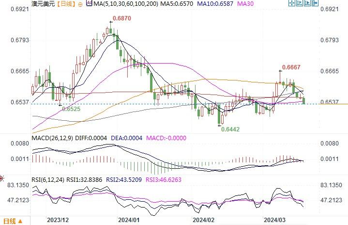 周一(3月18日),澳元兑美元下跌0.08%,至0.655美元。澳洲央行将于周二召开会议,市场普遍预期澳洲央行将维持利率在4.35%不变,但交易员将重点关注会后声明和总裁布洛克的新闻发布会,以了解该央行是否会缓和其温和的鹰派倾向。有分析认为,鉴于通胀减速快于预期和经济增长疲软,澳洲央行有可能取消或弱化其紧缩倾向。相比照的是,美联储年内的降息次数以及幅度预期都有可能会减少。息差上优势的渐失,将成为压制澳元的主要影响因素之一。日线图上,澳元/美元有跌穿布林带通道中轨线支撑之势,技术指标MACD似乎正在产生粘连有形成死叉状况,显示澳元近期偏于弱势。一旦日内澳联储在利率会议之后发表鸽派的看法,澳元/美元的弱势恐要进一步延续下去。