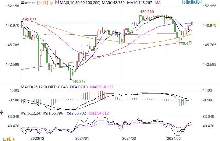 周一(3月18日),美元指数上涨0.145%,报103.600。今年以来,由于美国经济表现好于预期,这使得投资者减少了对美联储今年将快速、大幅降息的押注,美元指数已经录得略超2%的涨幅。周一美元兑日元汇率变化不大,略上涨0.02%收盘于149.11。过去几周日元走势震荡,兑美元上月一度低见150.88,随后在3月初反弹至一个月高点146.48,因经济数据强于预期,以及对日本央行准备结束八年负利率的押注不断升温。最近有一些迹象和一些日本央行委员发表的讲话,暗示他们认为现在是不再维持宽松金融环境的时候了。但本周日本央行利率会议是否会有所行动确实值得怀疑。一旦日本央行无实际结束负利率的行动,预料日元仍会回软。相反,若本次会议升息,在带给市场一定的惊喜之下,日元有望扭转近期的颓势。目前美元/日元处在横盘状态,汇价停留在布林带中轨线149.30附近,市场在等待着日本央行的利率决议。投资者需留意日内日本央行最后决议所带来的影响。
