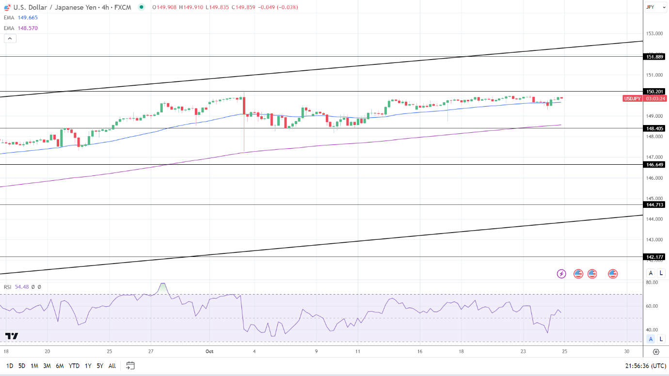 14-4小时RSI的54.48表明,美元/日元突破150.201阻力位,然后进入超买区域。