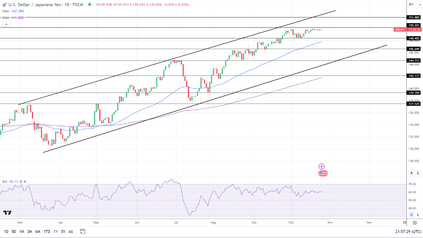 周三(10月25日)亚市早盘,美元/日元继续在149.88附近盘旋,显示交易员难逃日本央行在150关口出手干预汇市的威胁。但市场分析展望,周五情况可能会发生变化,美国通胀成为焦点,可能将打破汇市僵局,在进入超买区域前,带领美元/日元升破150门槛。