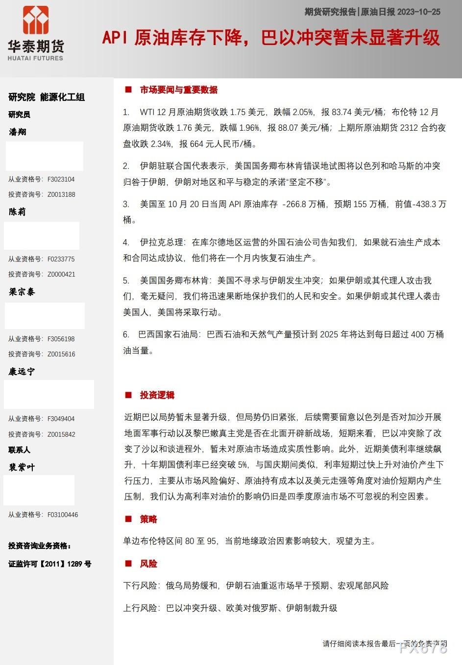 近期巴以局势暂未显著升级,但局势仍旧紧张,后续需要留意以色列是否对加沙开展地面行动以及黎巴嫩真主党是否在北面开辟新战场,短期来看,巴以冲突除了改变了沙以和谈进程外,暂未对原油市场造成实质性影响。此外,近期美债利率继续飙升,十年期国债利率已经突破5%,与国庆期间类似,利率短期过快上升对油价产生下行压力,主要从市场风险偏好、原油持有成本以及美元走强等角度对油价短期内产生压制,我们认为高利率对油价的影响仍旧是四季度原油市场不可忽视的利空因素。