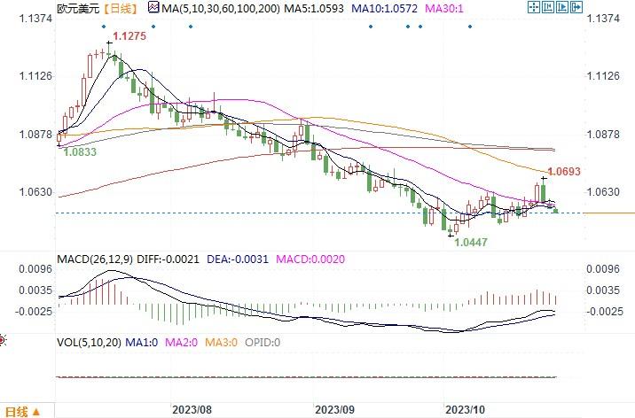 周三(10月25日),美元兑一篮子货币继续小涨,欧元兑美元延续回落走势,当日跌0.24%收盘于1.0563。周三美元继续走强,主要因企业业绩不佳引发对经济前景的担忧,投资者对风险较高货币的偏好减弱,而且公债收益率上升。之前科技巨头AlphabetGOOGL.O的云计算部门营收不及预期导致股价下滑,其他超大型股也因美国公债收益率上升而承压走低。周三当天公布的美国 9 月成屋销售强劲,美债收益率反弹,指标美国10年期公债收益率走高,重新向周一短暂突破的16年高点5.0%逼近。欧洲央行今日(周四)召开会议,预计将继续按兵不动,美国和欧元区收益率前景不一似乎在为欧元/美元空头提供了弹药。技术图形上,欧元/美元测试21日移动均线1.0561 若明显跌破1.0560,则将关注2023年低点1.0448。阻力位在55日均线1.0687,在该水平似乎容易吸引卖家倾向于卖出欧元。