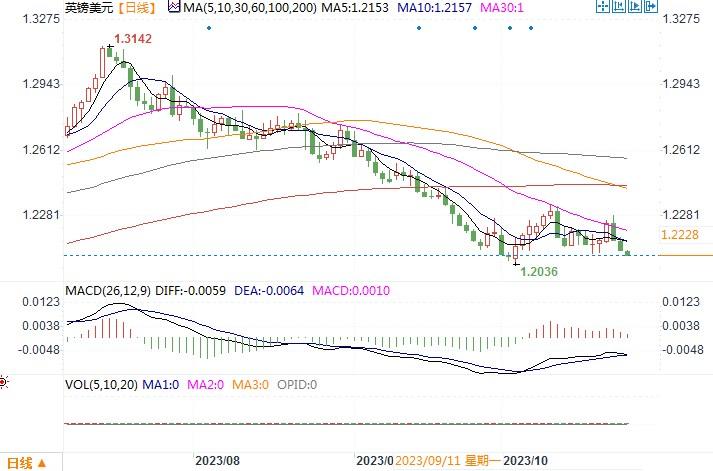 周三(10月25日),英镑/美元延续前一天的跌势,当日下跌0.33%,收报于1.2108美元。周二的数据显示劳动力市场出现松动,而10月英国标普全球服务业采购经理人指数(PMI)初值降至49.2,为1月份以来的最低值,低于50的荣枯分水岭。黯淡的经济数据佐证了英国央行下周可能维持利率稳定的观点。接受路透调查的绝大多数经济学家认为,英国央行现在很可能已经完成了政策紧缩,并将在11月2日把利率维持在5.25%不变。货币市场交易员也认为英国利率已经见顶,明年年底前降息的可能性达到100%。受经济发展的拖累,英镑在息差方面的优势已显得荡然无存,加之最近地缘冲突避险资产吃香,英镑吸引力微弱。技术图型上,5、10 和21日移动均线下滑,动量指标滑,布林带区间扩大,周的双重底1.2093在望,跌破后下看10月低位1.2038,若收于周三高点1.2175上方,信号将有望恢复为中性。
