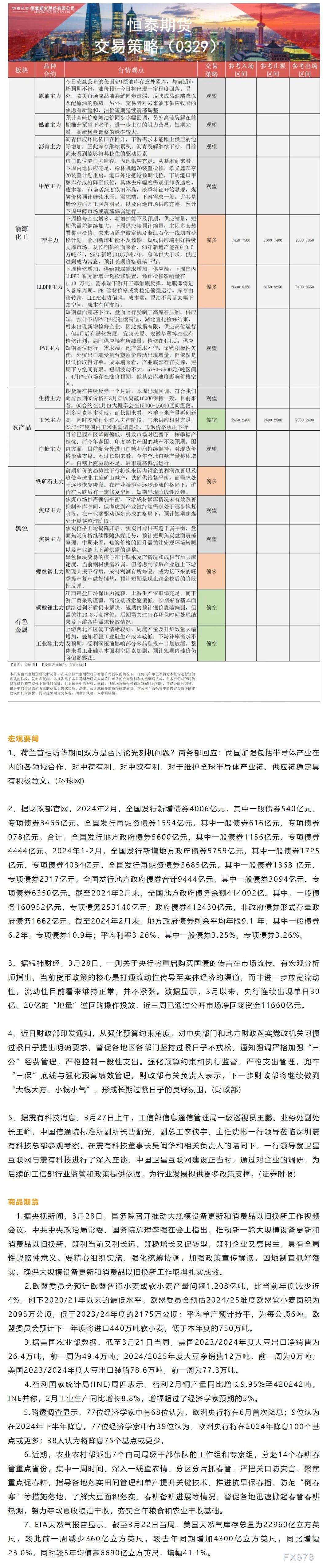 以下是恒泰期货今日早间交易策略,覆盖品种有:宏观分析、原油燃料油等能源化工、豆粕豆油大豆玉米白糖生猪等农产品、黑色系如铁矿石焦煤焦炭螺纹钢、有色系如工业硅碳酸锂等。