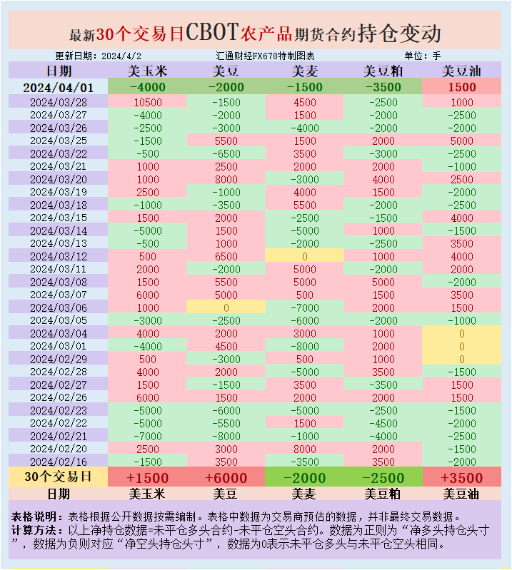 根据汇通财经观察,海外交易商估算的结果显示,本周一(4月1日),大宗商品基金增加CBOT美小麦、美豆、美豆粕、美玉米投机性净空头头寸,增加美豆油投机性净多头头寸。最新30个交易日,大宗商品基金增加CBOT美豆粕、美小麦投机性净空头头寸,增加美豆、美玉米、美豆油投机性净多头头寸。
