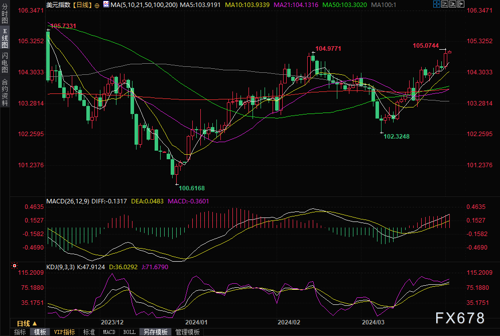 投资者在近期大量押注美元走强,特别是兑G10货币,反映了对主要央行政策会议的不同解读和相对利率变化的影响。美元的相对吸引力正在吸引投资者的注意,美元指数周一(4月1日)大涨0.45%,最高触及105.07,为11月14日以来新高。周二亚市,美元指数守在高位,目前交投于105.04附近。