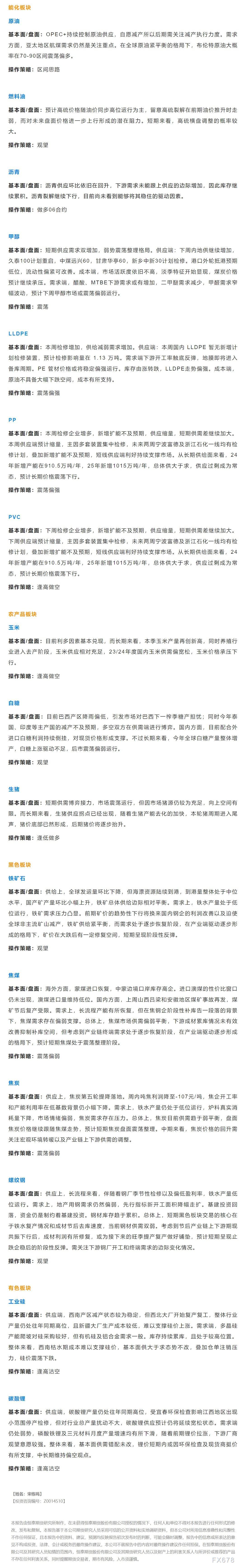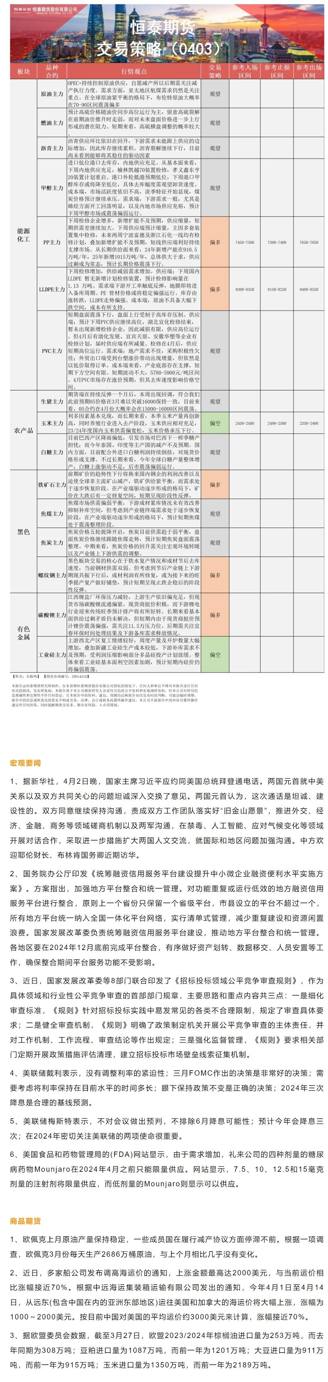 以下是恒泰期货今日早间交易策略,覆盖品种有:宏观分析、原油燃料油等能源化工、豆粕豆油大豆玉米白糖生猪等农产品、黑色系如铁矿石焦煤焦炭螺纹钢、有色系如工业硅碳酸锂等。