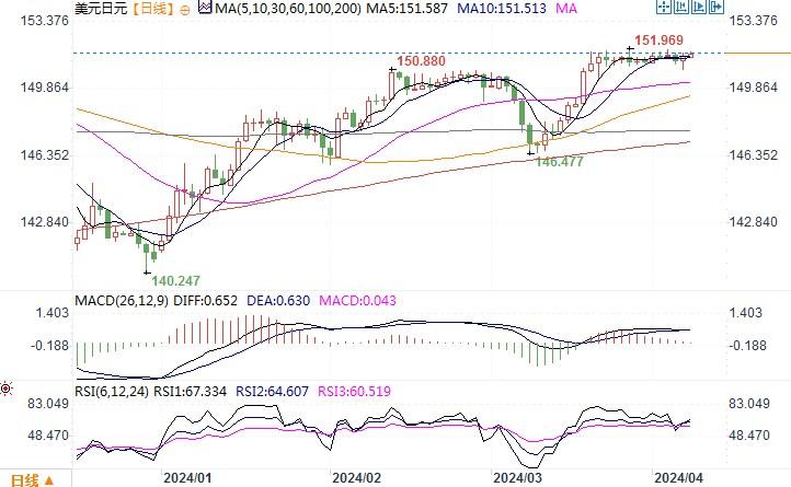 上周五(4月5日),美元指数上涨0.048%,报104.27,上周美元指数走势颇为动荡,从五个月高点跌至两周低点,周五时由于受强于预期的非农数据抬捧,略收复部分失地,但周线录得下跌。美国劳工部在周五发布的备受关注的就业报告中称,3月非农就业岗位增加30.3万个。接受路透调查的经济学家此前预计就业岗位将增加20万个。根据芝商所的FedWatch工具,强劲的就业报告公布后,美国利率期货市场对6月降息几率的预测缩减至54.5%。经济强劲以及石油、铜、咖啡和可可等大宗商品价格上涨,使通胀形势变得更加复杂。明尼阿波利斯联储总裁卡什卡利周四就曾发表评论称,如果通胀继续停滞不前,今年可能不需要降息。美元也是因此反弹。日元兑美元上周五下跌0.14%,至151.54。但是日本重要官员继续纷纷发表将会干预的讲话,也是继续限制了日元的大幅波动。日本财务大臣铃木俊一周五重申,日本政府决心采取适当行动防止日元大幅下跌。据《朝日新闻》周五报道,日本央行总裁植田和男也表示,如果日元疲软对日本经济造成难以忽视的影响,日本央行可能会“采取货币政策应对”。美元/日元继续在一种进退不得的纠结市场氛围下保持着窄幅的波动状况。窄幅波动区间集中在150-152之间,只有区间任一端出现彻底突破情景,方能走出较明显的趋势性行情。
