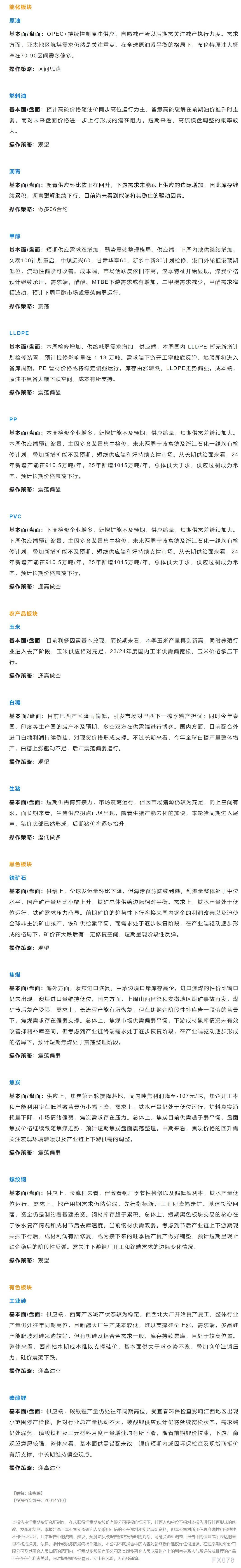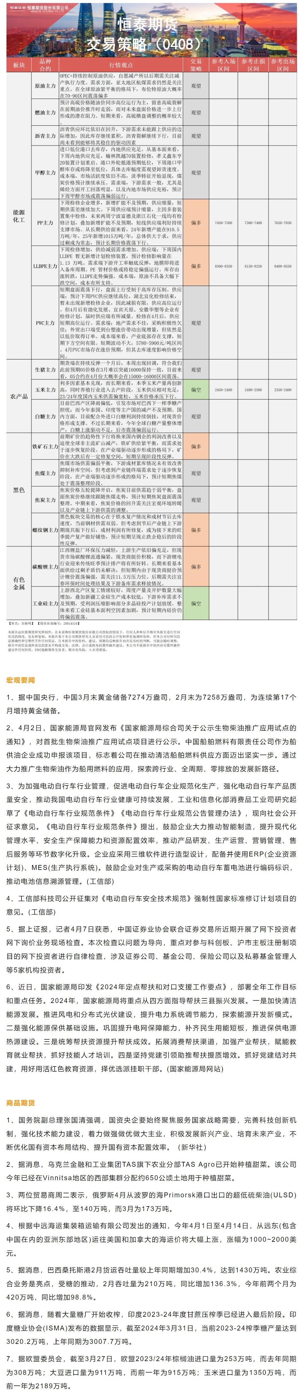 以下是恒泰期货今日早间交易策略,覆盖品种有:宏观分析、原油燃料油等能源化工、豆粕豆油大豆玉米白糖生猪等农产品、黑色系如铁矿石焦煤焦炭螺纹钢、有色系如工业硅碳酸锂等。