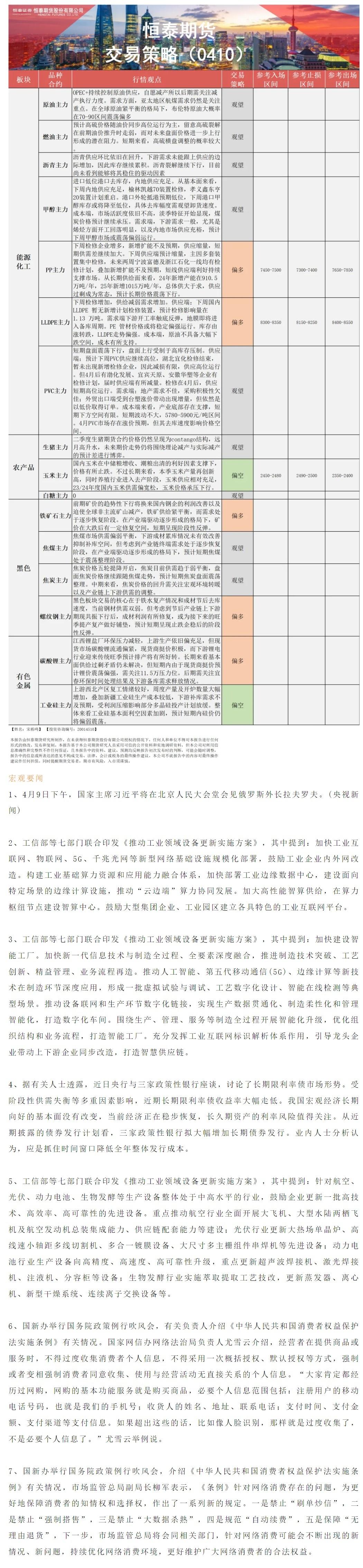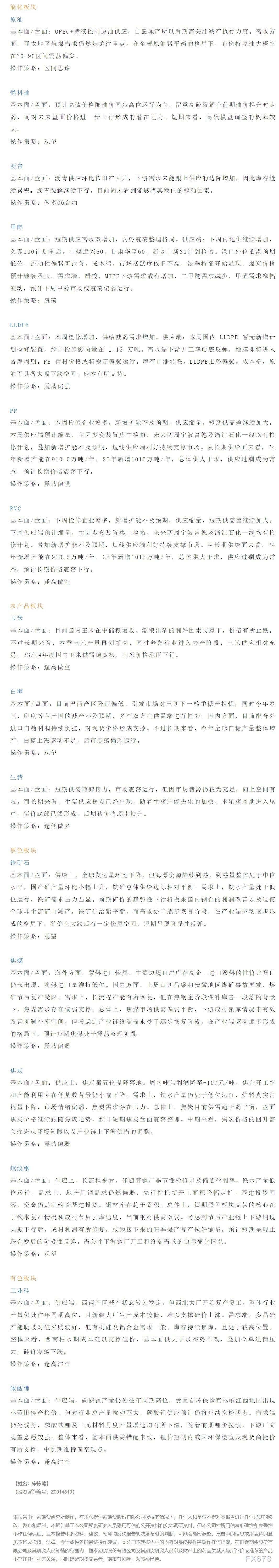 以下是恒泰期货今日早间交易策略,覆盖品种有:宏观分析、原油燃料油等能源化工、玉米白糖生猪等农产品、黑色系如铁矿石焦煤焦炭螺纹钢、有色系如工业硅碳酸锂等
