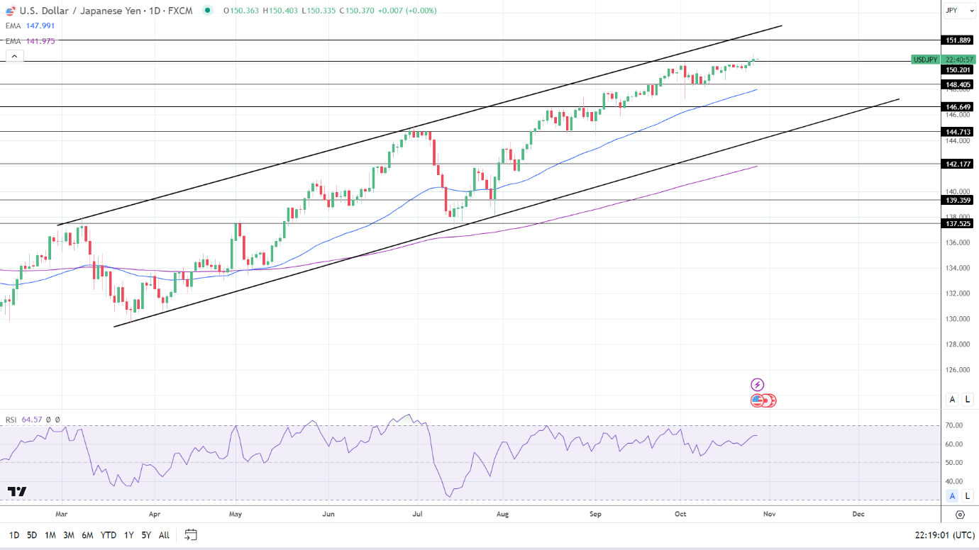 周四,美元/日元货币对表现出显着的强势,突破了150的重要心理关口。当前上涨轨迹的延伸凸显了不同时间框架的看涨情绪,包括长期、中期和短期前景。