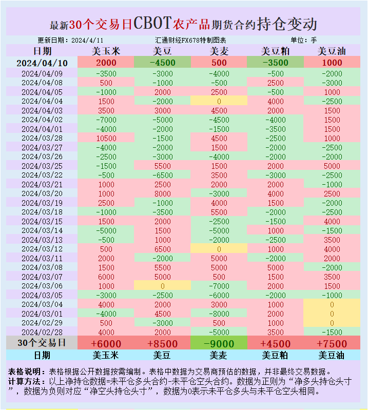 根据汇通财经观察,海外交易商估算的结果显示,本周三(4月10日),大宗商品基金增加CBOT美豆粕、美玉米、美麦投机性净空头头寸,增加美豆、美豆油投机性净空头头寸。最新30个交易日,大宗商品基金增加美豆、美玉米、美豆油、美豆粕投机性净多头头寸,增加美麦投机性净空头头寸。