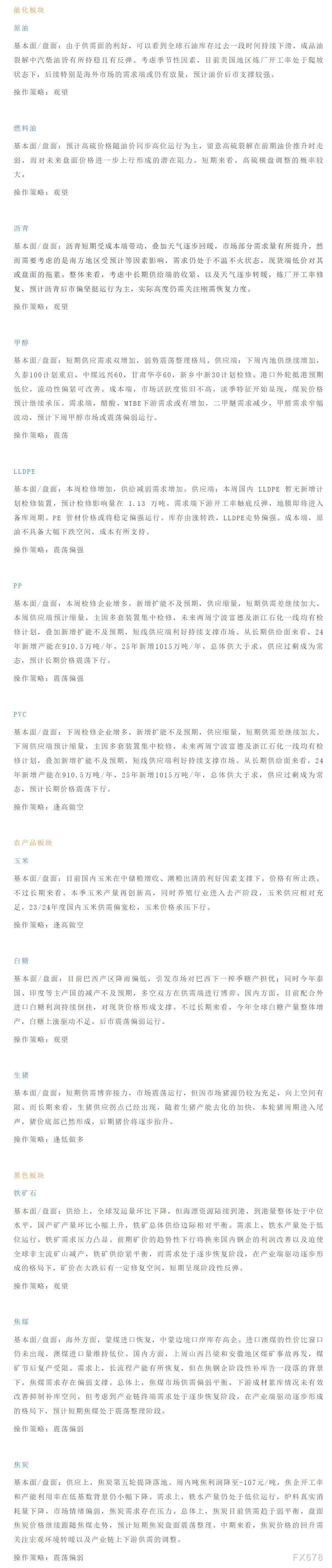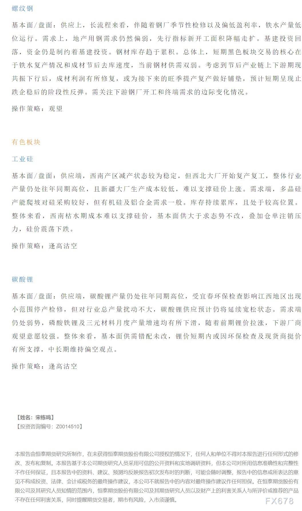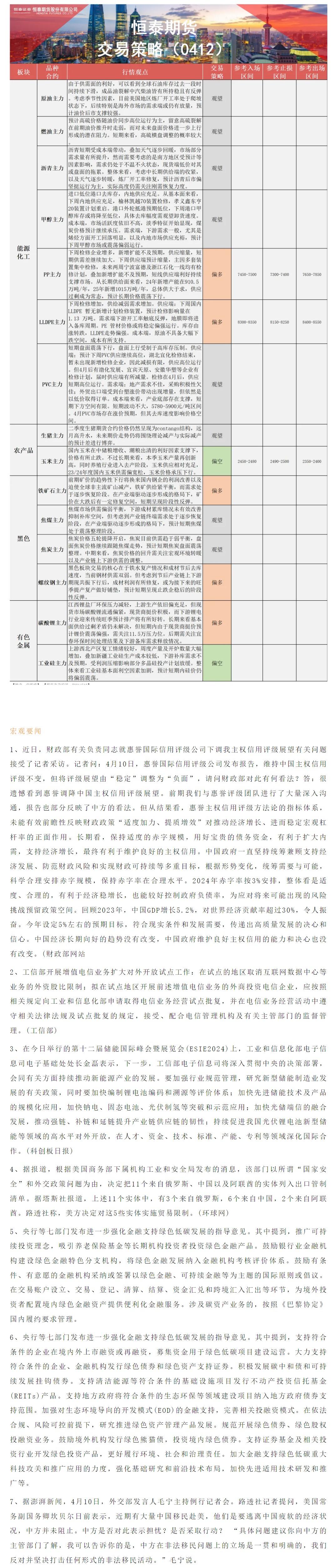 以下是恒泰期货今日早间交易策略,覆盖品种有:宏观分析、原油燃料油等能源化工、玉米白糖生猪等农产品、黑色系如铁矿石焦煤焦炭螺纹钢、有色系如工业硅碳酸锂等。