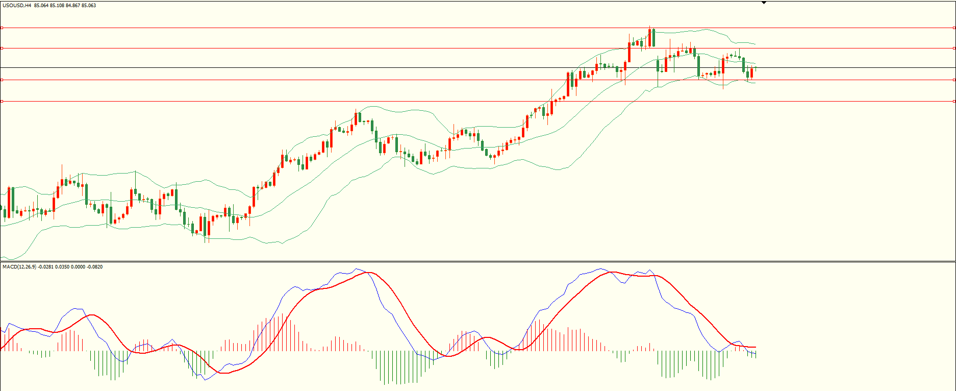 原油昨日小幅反弹后承压下行,盘中回落至第一支撑下方略有反复,日线报收上下影线中阴线,支撑与阻力并存,短线陷入震荡格局,从4H来看,布林中轨偏下,MACD零轴附近运行,日内下方首要支撑84.40-50,第二支撑83.40,上方阻力86.00,87.00-10,保持在第一支撑上方短线有望回测第一阻力。