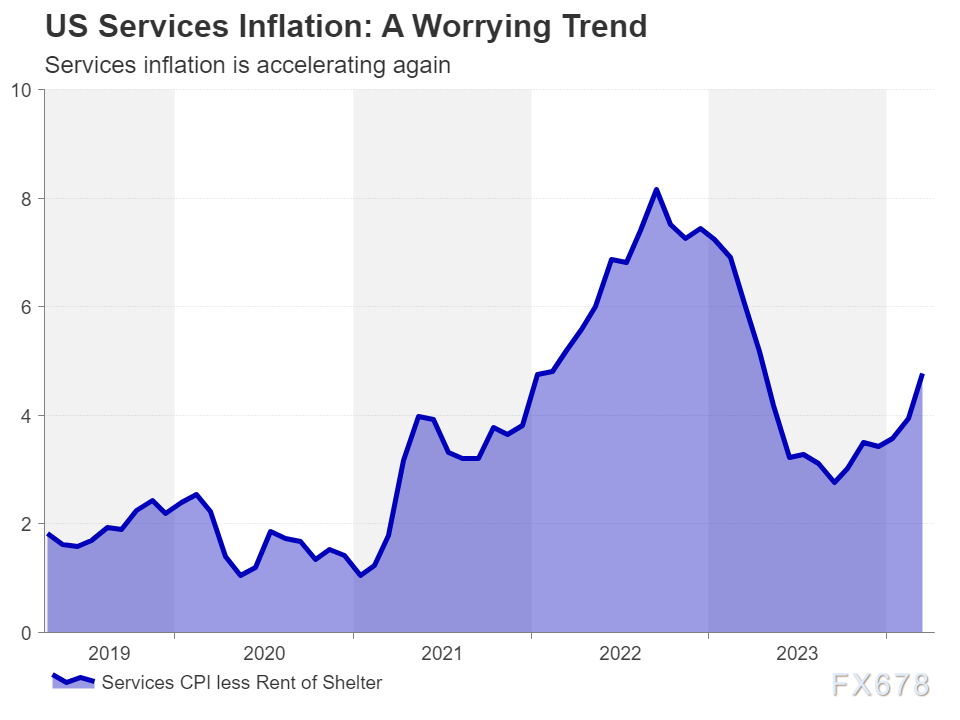 自2023年6月以来,以消费者价格指数(CPI)衡量的整体通胀率一直在走高,生产者价格也是如此。此外,衡量服务业的关键指标CPI在3月份跃升至4.8%,远未下降。服务价格压力一直是美联储抗击通胀过程中最棘手、最棘手的问题。